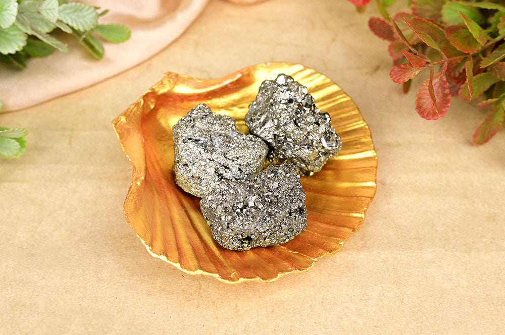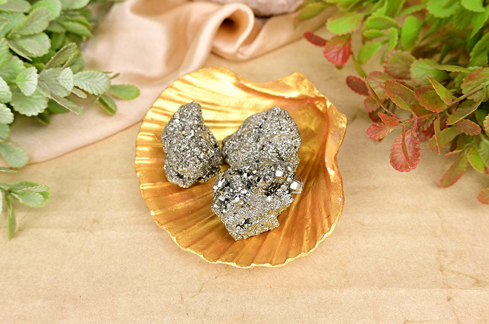 3 Pyritsteinkiesel werden in einer Tigeraugenschale aufbewahrt, um sie in Ihrem Zuhause aufzubewahren und Fülle anzuziehen. Sie können diese Kieselsteine auch als Glücksbringer bei sich tragen. Pyrit, auch Narrengold genannt, ist ein Kristall der Manifestation und positiver Energie.